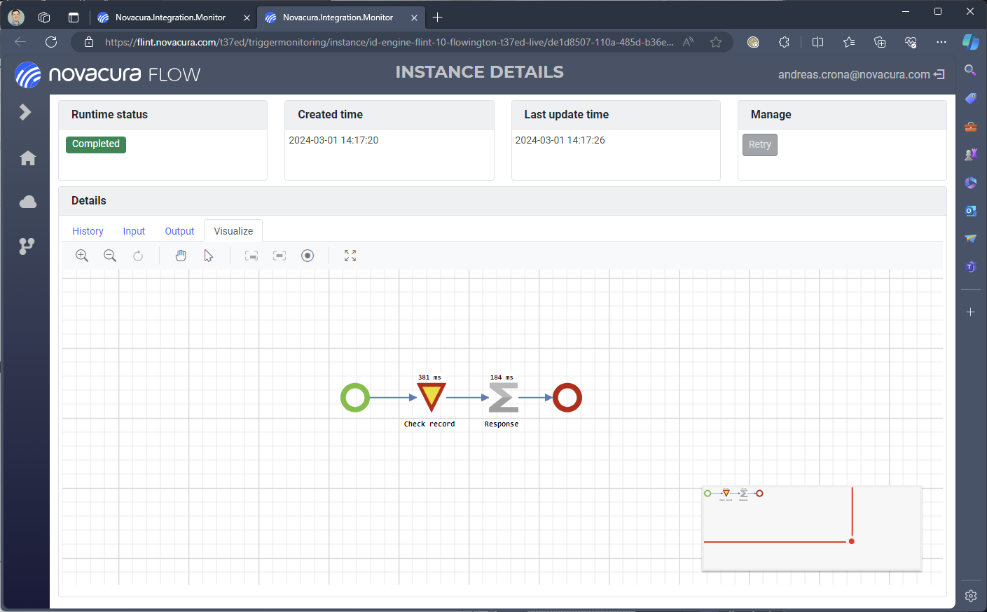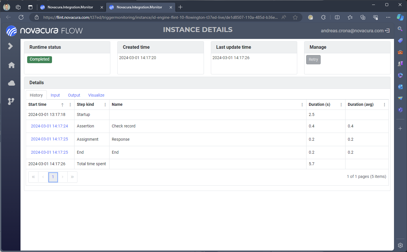 This is useful in the case the cause of the error appearing in your workflow execution can been fixed outside of the integration and the workflow. This can be the case for example if the connector of a machine step is misconfigured or for some other connectivity issue cannot execute. Such an error cause can be remedied for example by updating the connector configuration or re-enabling the connectivity. When the cause of the error has been remedied you can Retry the integration execution by clicking the button. The integration execution will then pick up again from after the last successful step. So no previous successful steps will be re-executed, this is particularly important to know when it comes to machine steps.