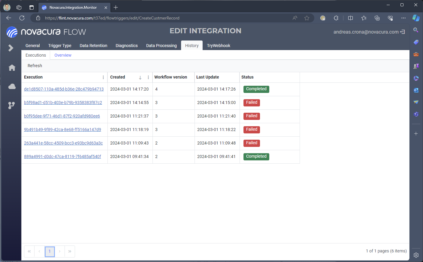 On the integration click the tab History to see a list of all historic, and current, executions, and their status.