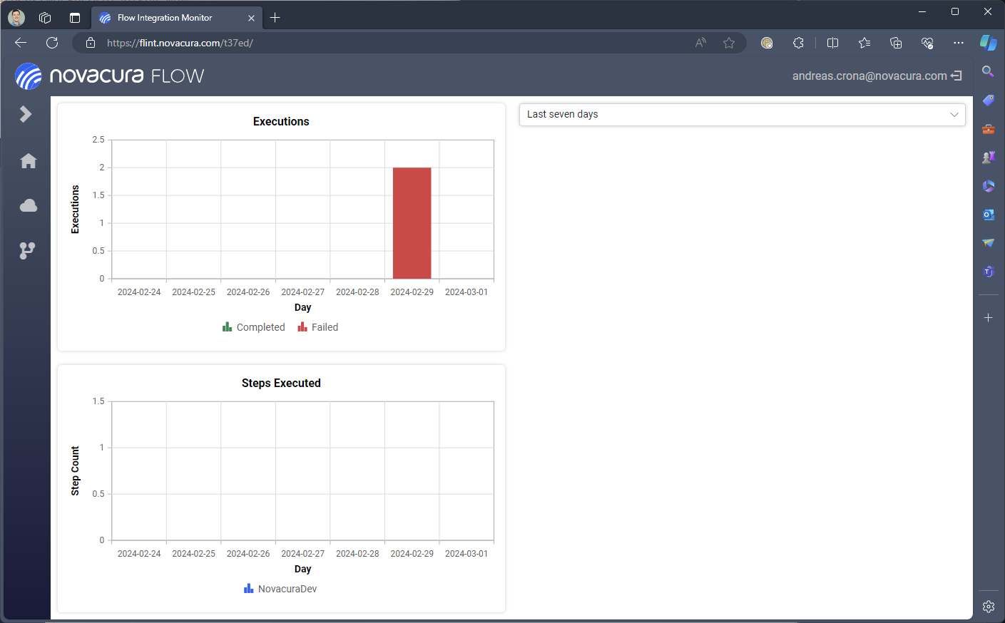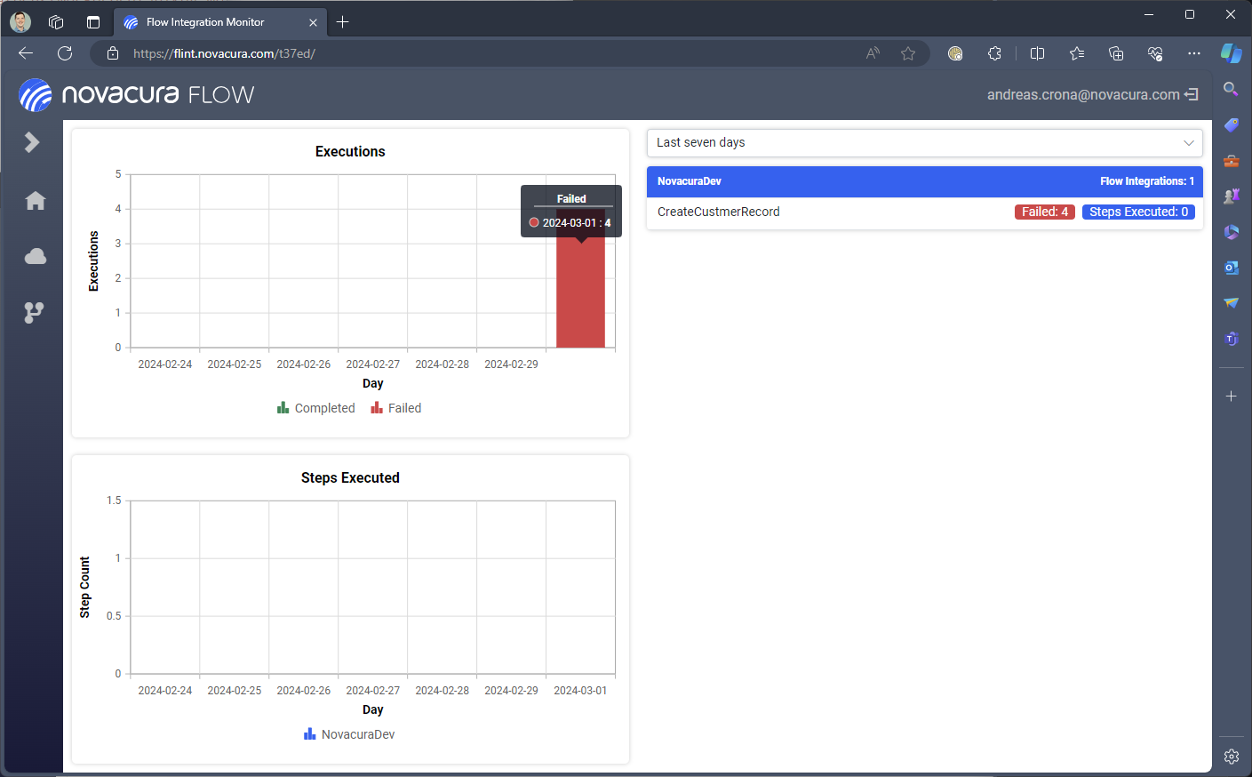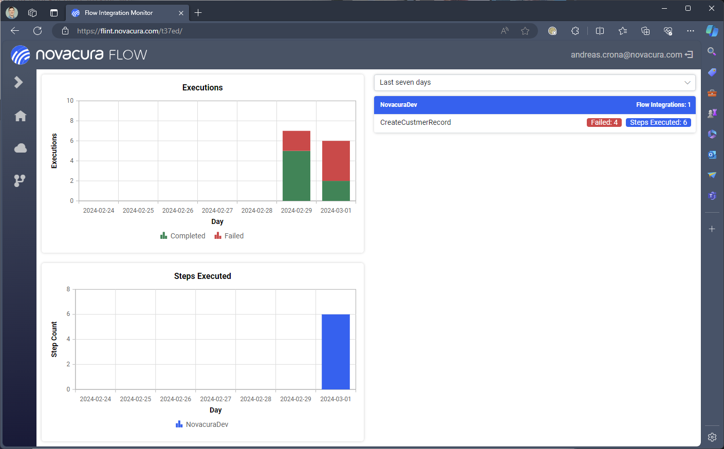 The upper graph will show the total number of successful and failed integration executions per day. If you click any red or gren staple the list to the right will drill down to the executions that the staple consist of. Use this to easily navigate to the failed integrations.