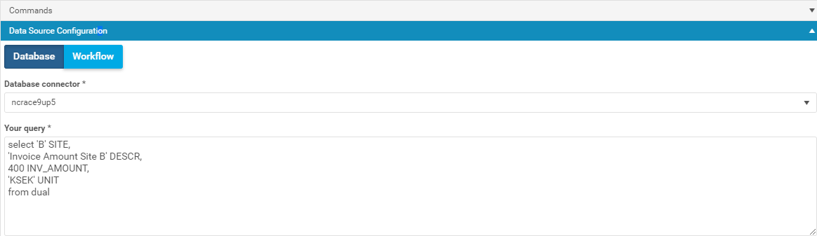 For more information how to set up a Workflow Data Source, please read this section: Fetching data from workflows The data retrived from the workflow should match what is needed in the Output Datasource Configuration section, which is described below.